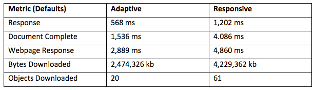 然而,如果客戶和公司存在預算,自適應設計可能是更好的選擇。根據Catchpoint進行的一個測試,他們在Wordpress創建兩個網站,一個使用標準的WP TwentyFourteen響應式主題,另一個使用一個名為Wiziapp的插件。